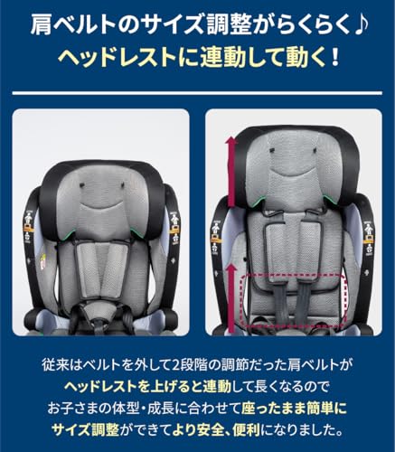 着脱が簡単なヘッドレスト・肩ベルトの調節機能を活用し、子どもの成長に合わせてこまめに調整してください。