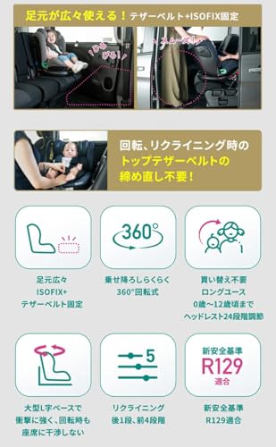 • 【メリット】360度回転で乗せ降ろしが楽、テザーベルトの締め直し不要で手間が省ける、新生児から12歳までの長寿命設計、安全基準R129対応で安心。