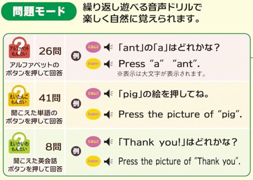 - アルファベットや英単語の基本を液晶パネルとネイティブ発音で学習可能