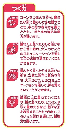 かさねてコーンは指先の器用さだけでなく、色彩感覚や数字認識にもつながり、子どもの総合的な発達支援に役立ちます。