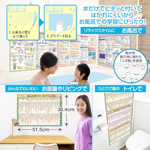 防水仕様の日本製B3サイズポスターで、理科と国語の知識をお風呂で効率的に学べるため、お風呂学習に関心のある方におすすめです。